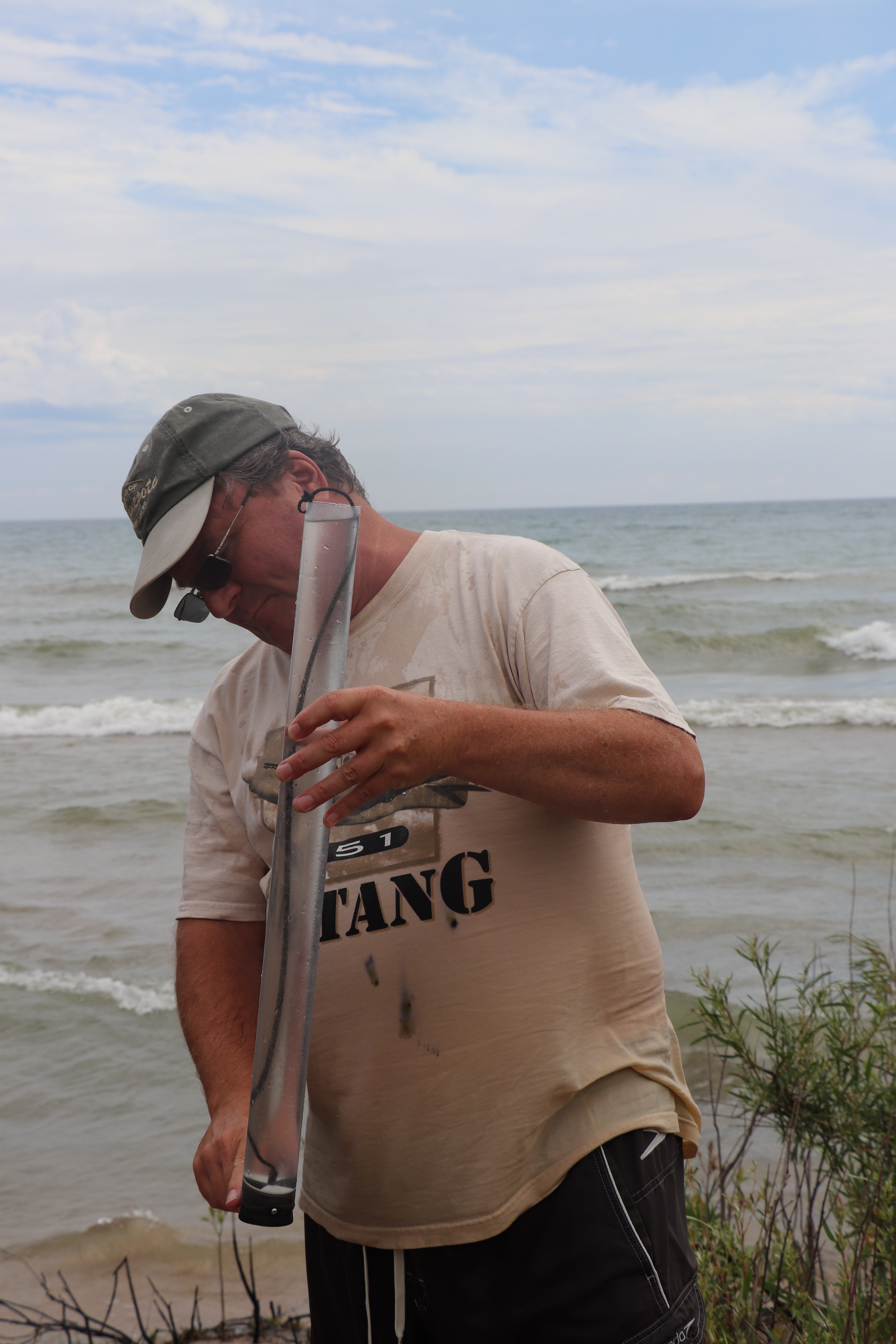 Just before setting out we took a stroll on the beach of Lake Michigan. We ran into a scientist called John Cabrielse from Cardinal Environment Inc, testing the water quality of Lake Michigan in Kohlen-Andrae State Park. He is taking samples and mesurements three times a week to make sure the public can safely swin in those water. He used a thermometer and a tube (1 meter x 5 centimeters) to evaluate the turbidtude of the water. Then he took a sample which would be sent to a laboratory to test for E-coli levels. This would determine if the beach was safe for the health of the public but also most importantly the lake’s ecosystem. E-coli is a common and not necessarily harmful to humans. It is a good indicator to show scientists like john if there are more dangerous bacteria in the water. A green sign indicates a healthy and clean beach deemed safe. John also explained the problems with invasive species and through this the lack of plankton to feed wildlife.